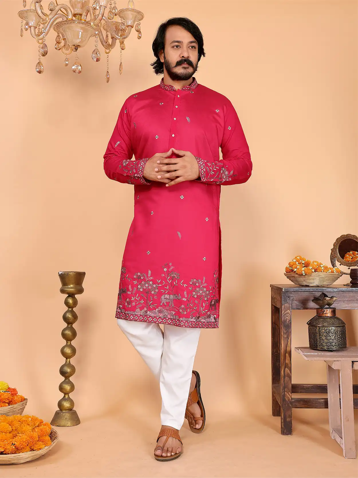 Men's Royal Elephant Garden Embroidered Magenta Pink Kurta Set