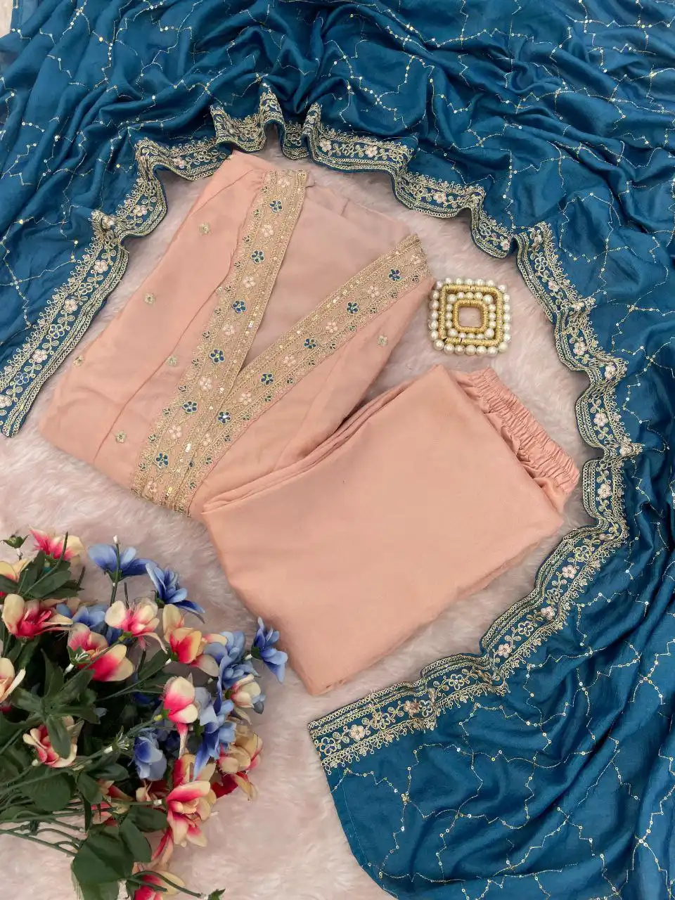 Blush pink meets bold teal in this beautifully embroidered kurta set, blending subtle charm with contemporary contrast. Designed for effortless elegance at celebrations and festive events.