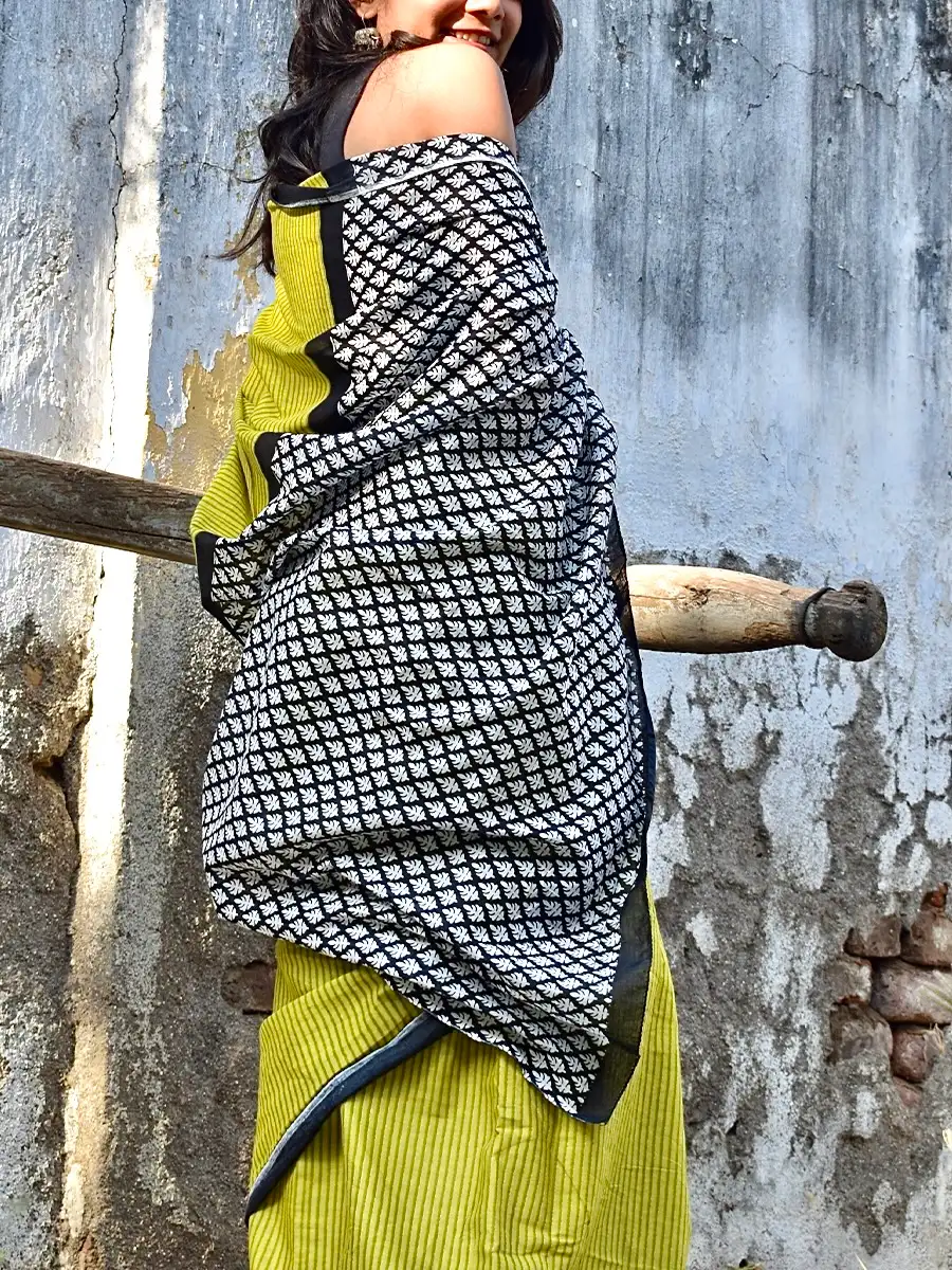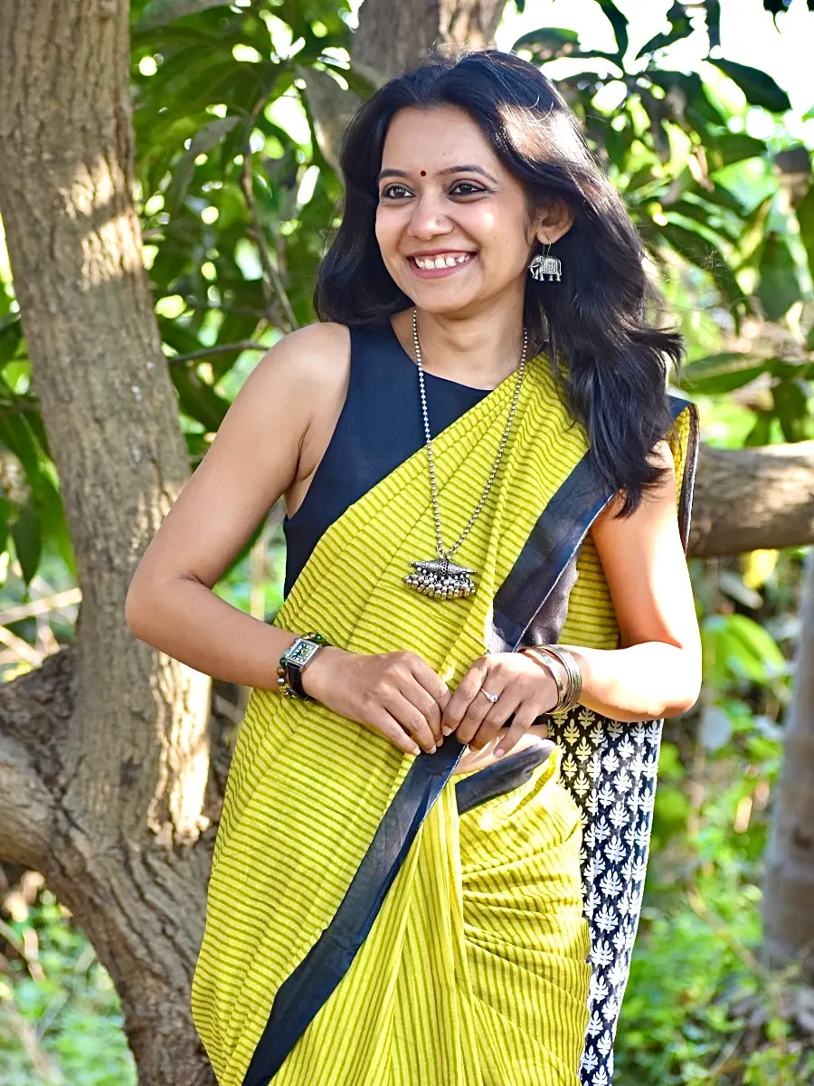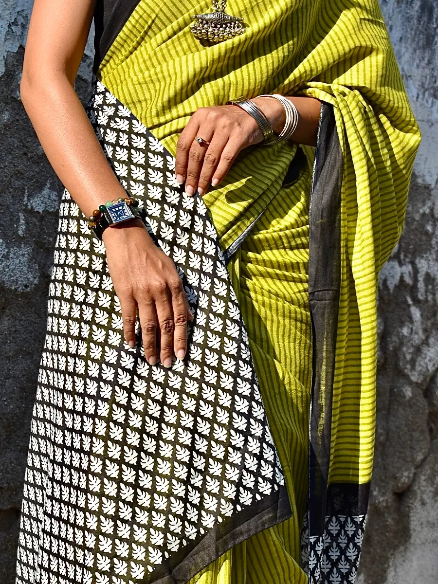 Fresh, playful and effortlessly stylish, this lime green saree with a bold contrast border brings a modern twist to traditional draping. Perfect for brunch gatherings, office days and moments that call for confident charm.