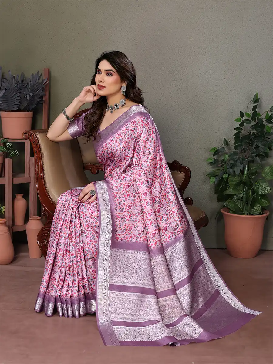Soft, feminine and effortlessly graceful, this pastel saree is adorned with delicate floral prints and a lustrous border that adds a subtle festive glow.