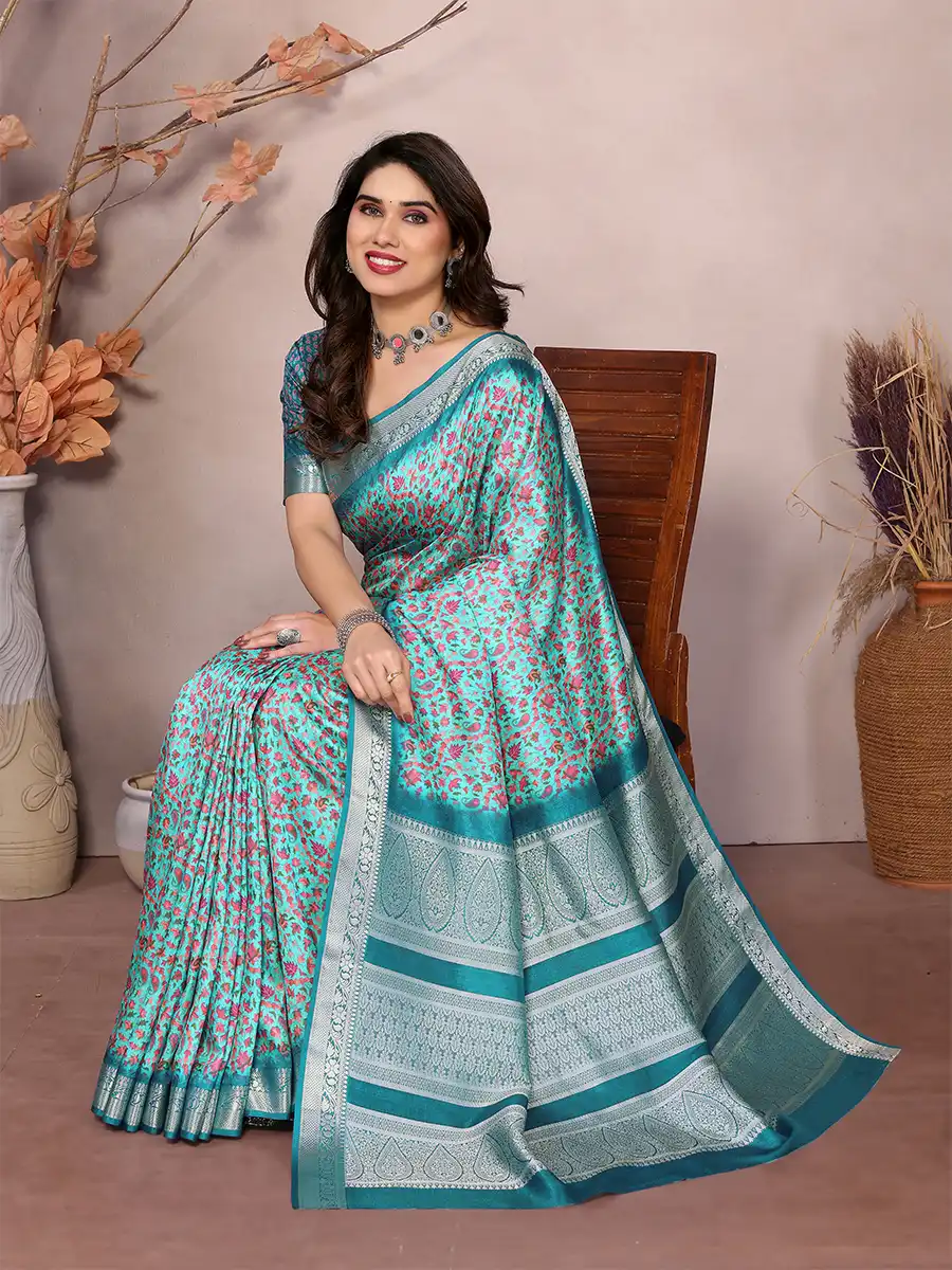 Turn heads with this stunning teal saree adorned in floral motifs. A graceful blend of richness and charm, perfect for festive celebrations and special occasions.