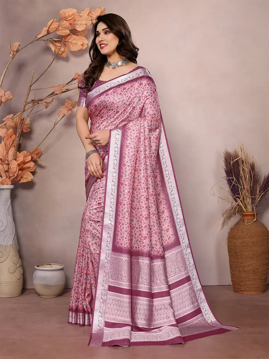 Draped in a soft blush hue with delicate floral motifs and a rich border, this saree exudes timeless grace with a romantic touch.
