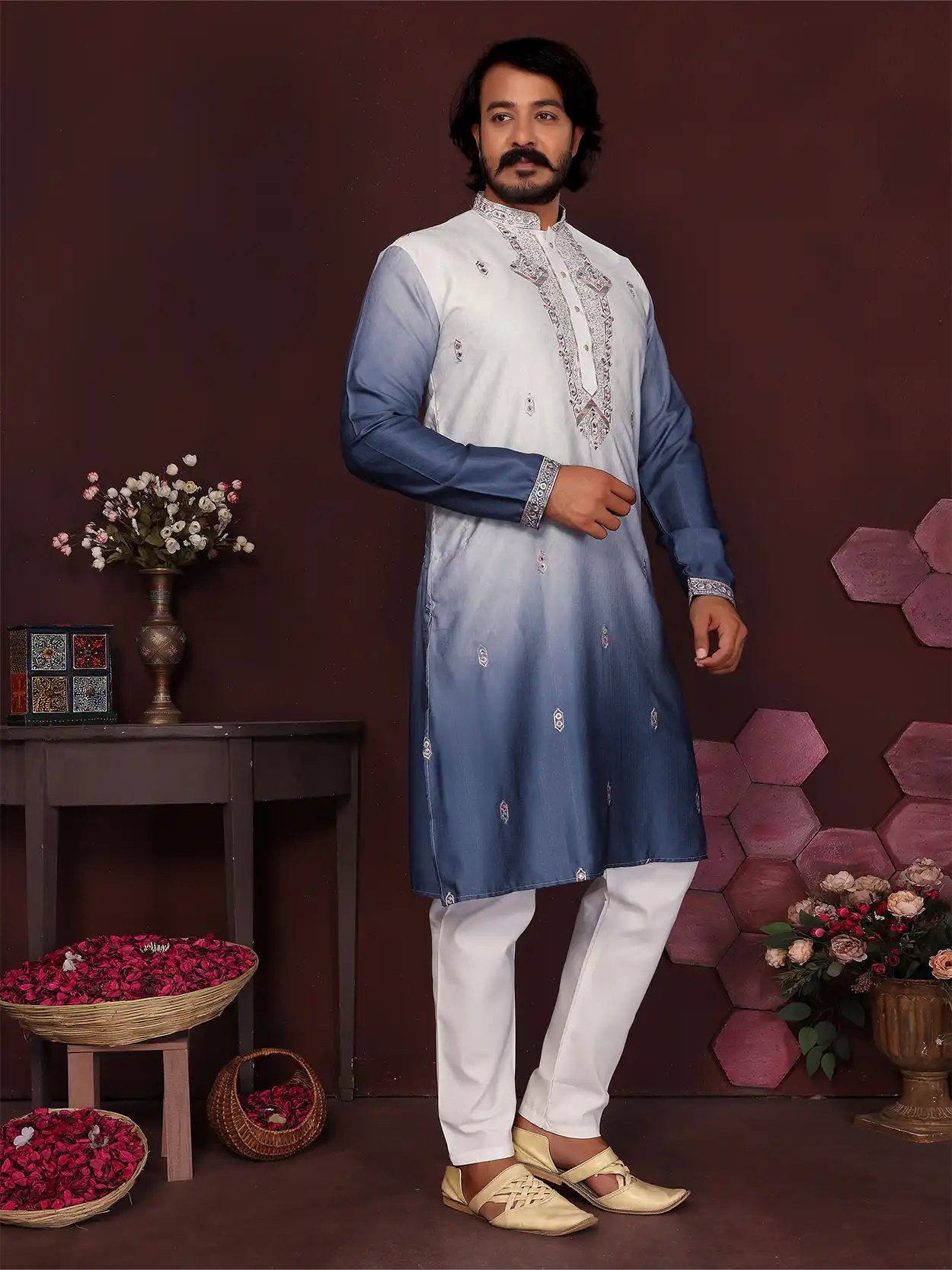 Crafted for modern celebrations, this pastel toned kurta set features delicate thread embroidery and a soft ombré finish perfect for making a subtle yet striking statement.