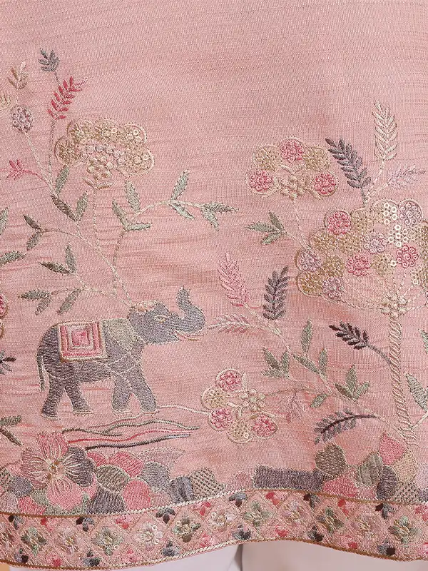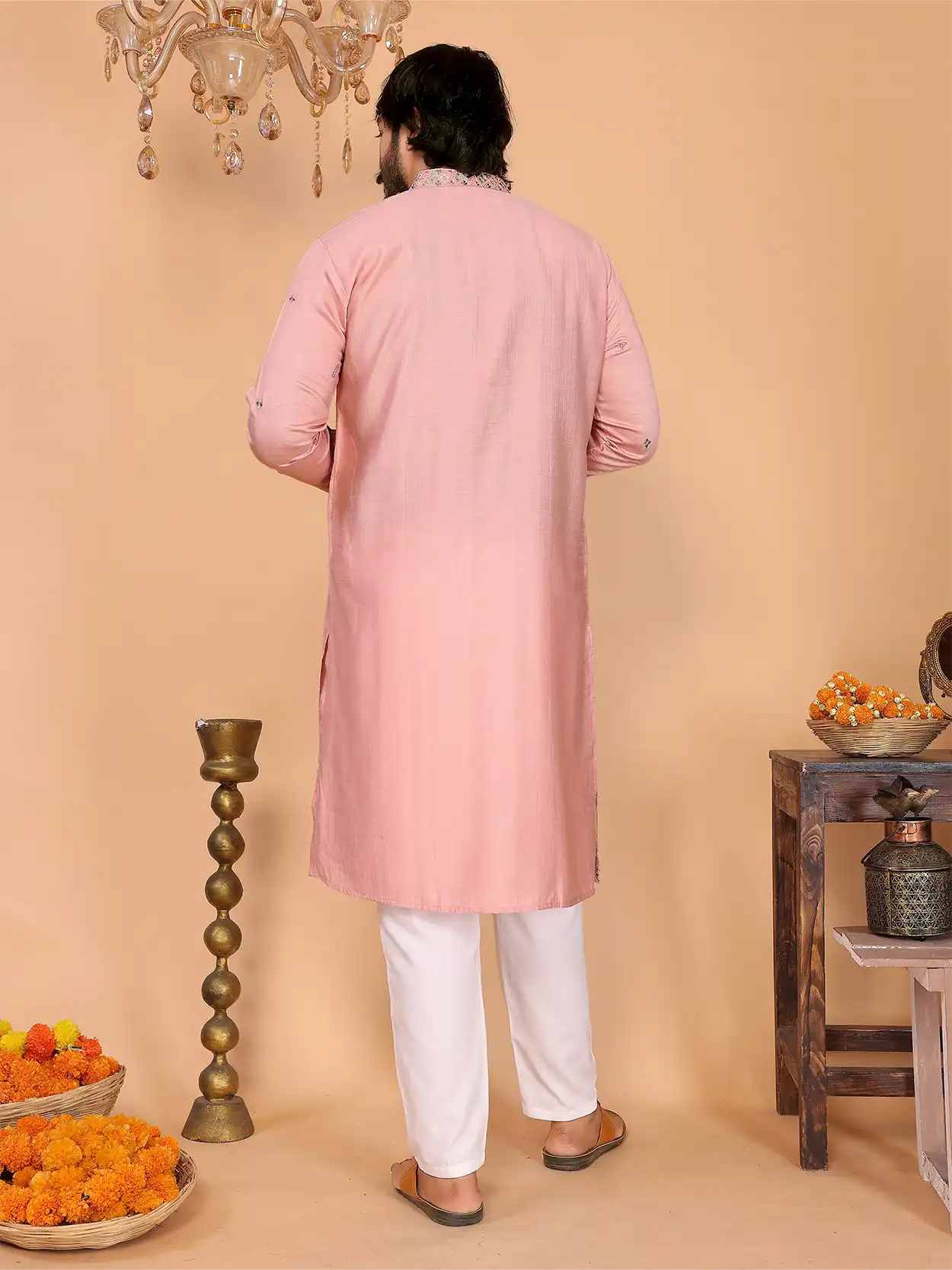 Elevate your occasion wear with this dusty pink kurta set, adorned with fine embroidered accents and statement borders. A refined silhouette designed for the modern man with a love for tradition.