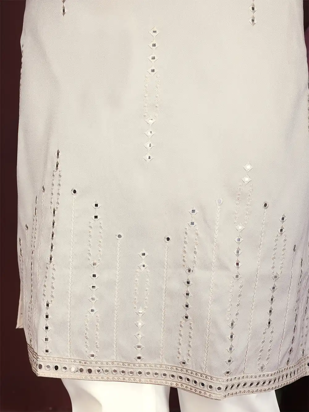 Designed for the modern gentleman, this cream kurta set with refined mirror embroidery and detailed cuffs delivers a confident festive statement.