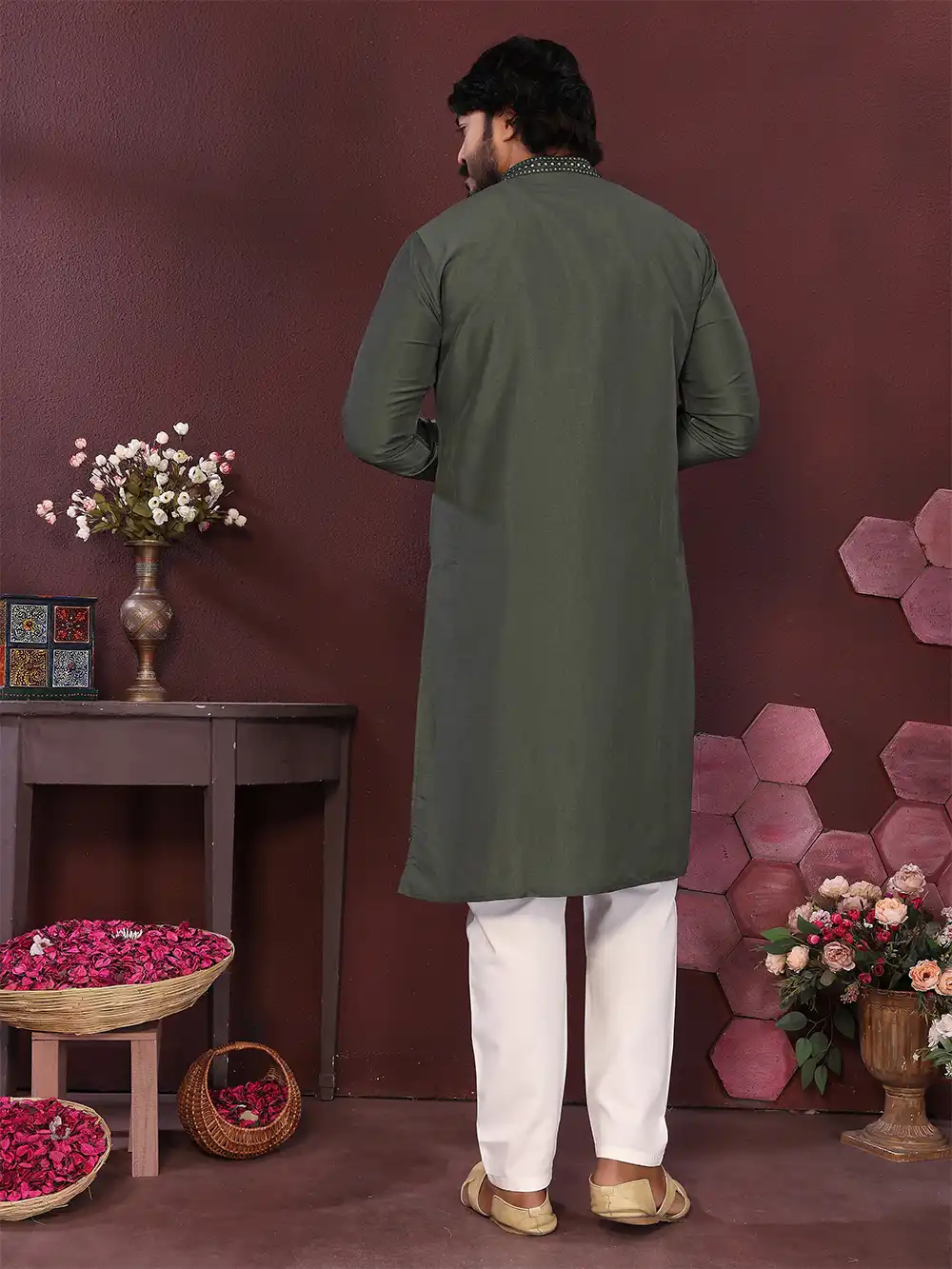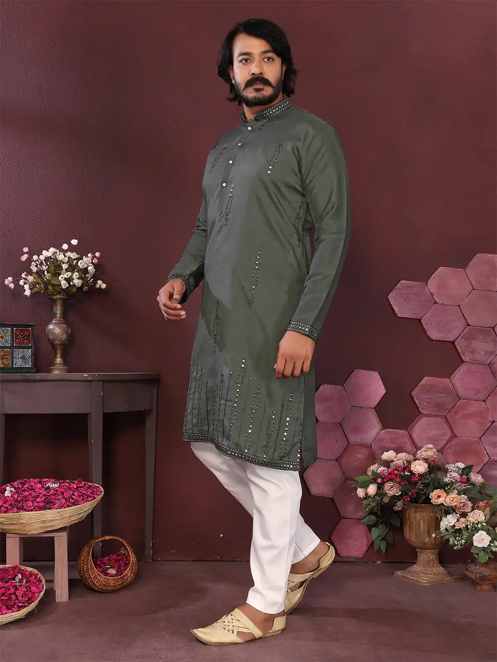 Designed for the modern gentleman, this olive green kurta set with refined mirror embroidery and detailed cuffs delivers a confident festive statement.