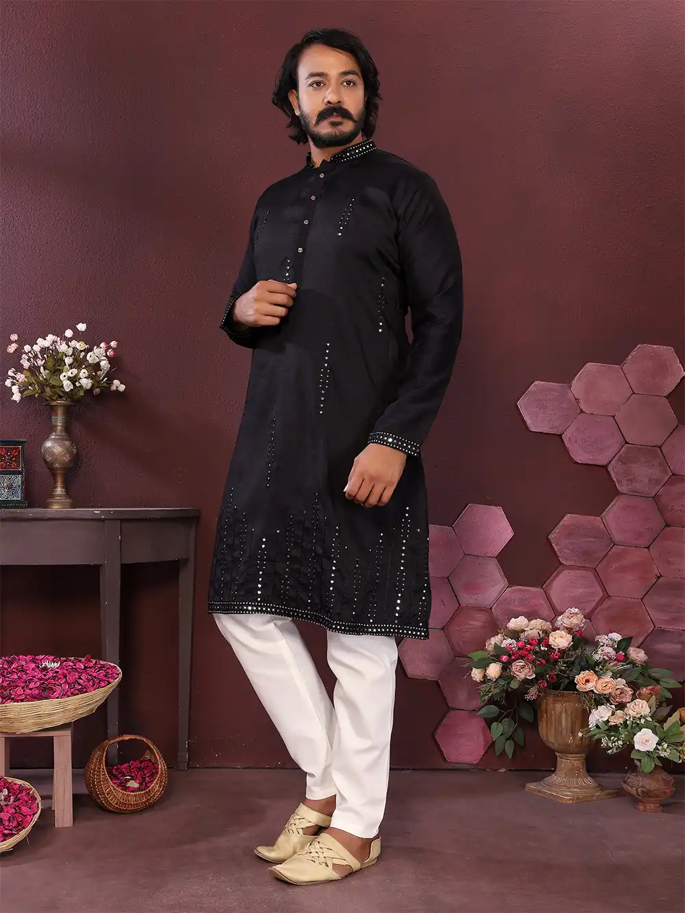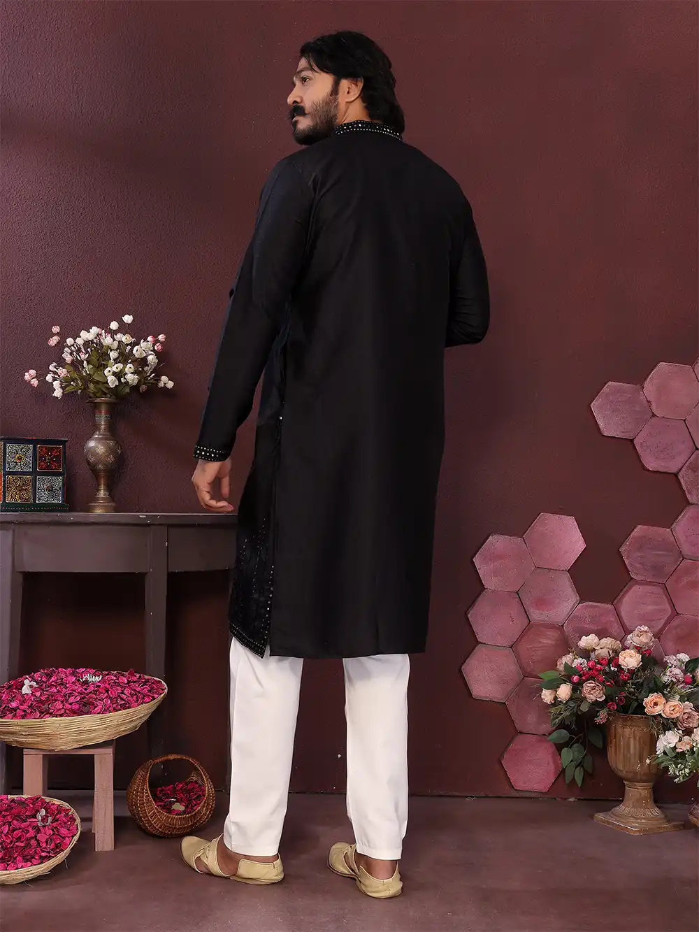 Designed for the modern gentleman, this black kurta set with refined mirror embroidery and detailed cuffs delivers a confident festive statement.