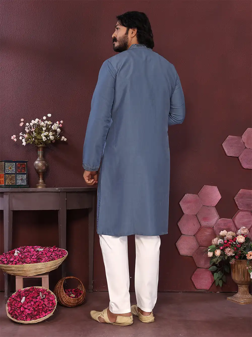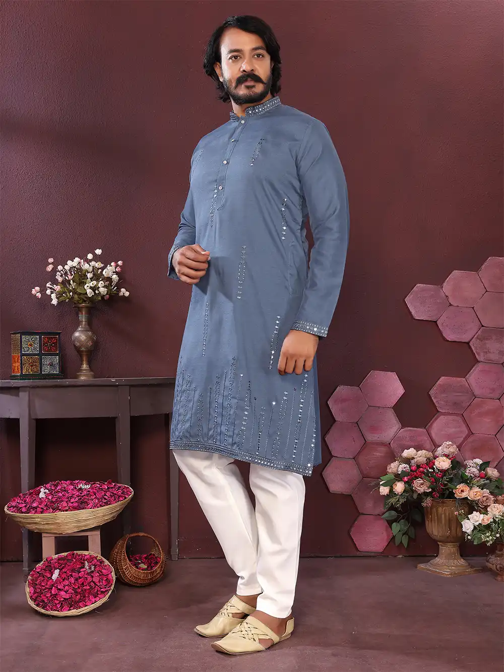 Designed for the modern gentleman, this dusty blue kurta set with refined mirror embroidery and detailed cuffs delivers a confident festive statement.