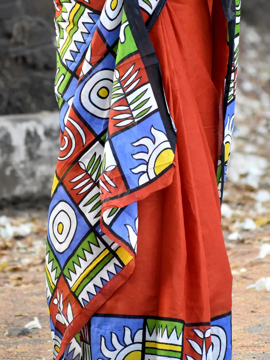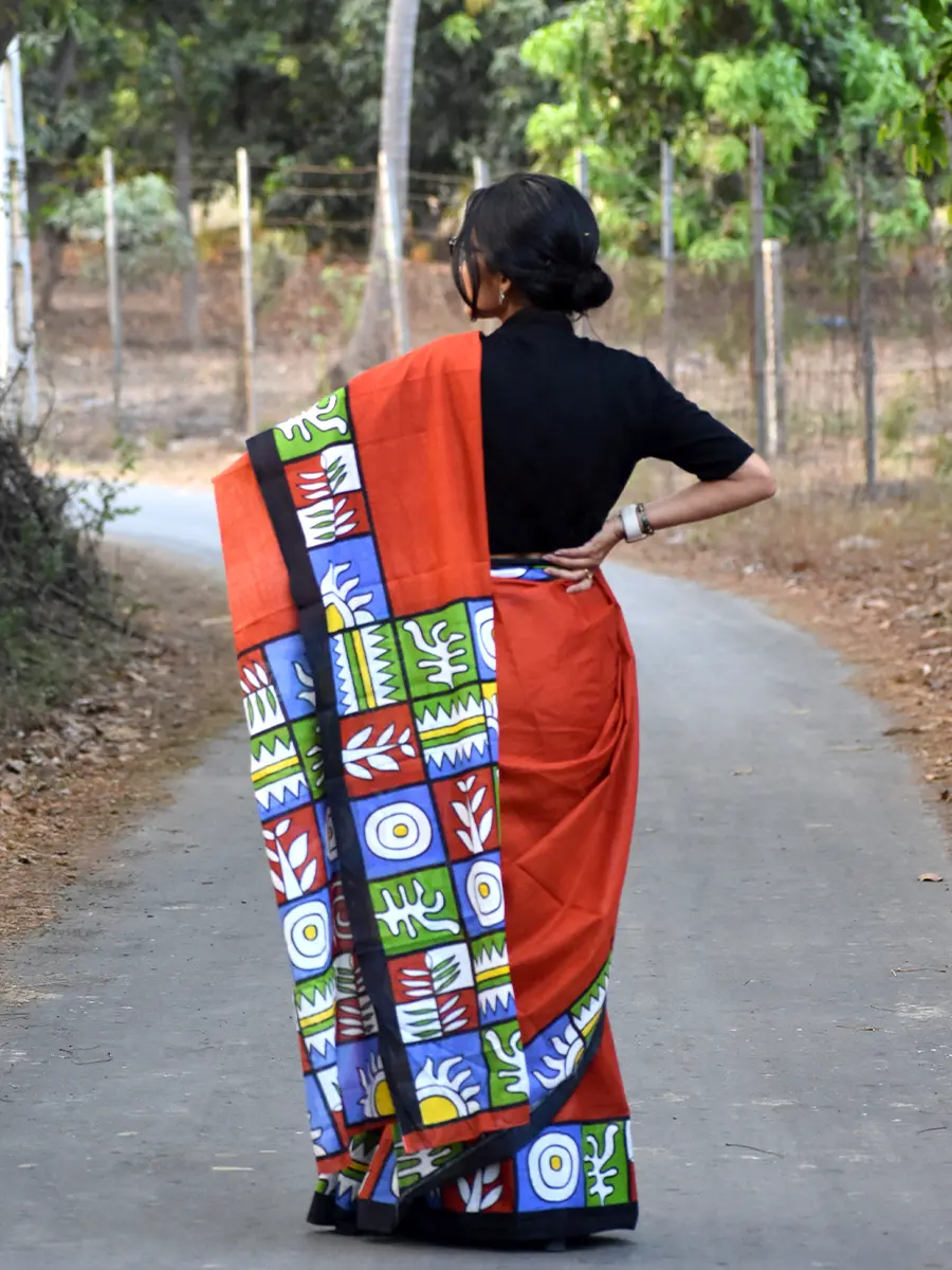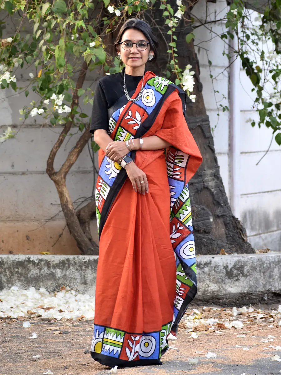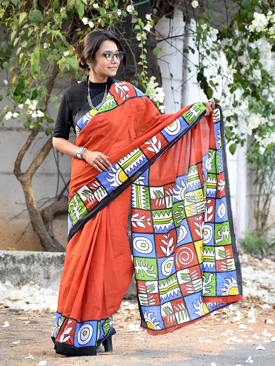 Vibrant and artistic, this rust orange saree is elevated with bold multicolour abstract prints and a statement pallu. A perfect choice for office wear or creative outings, blending tradition with a contemporary edge.