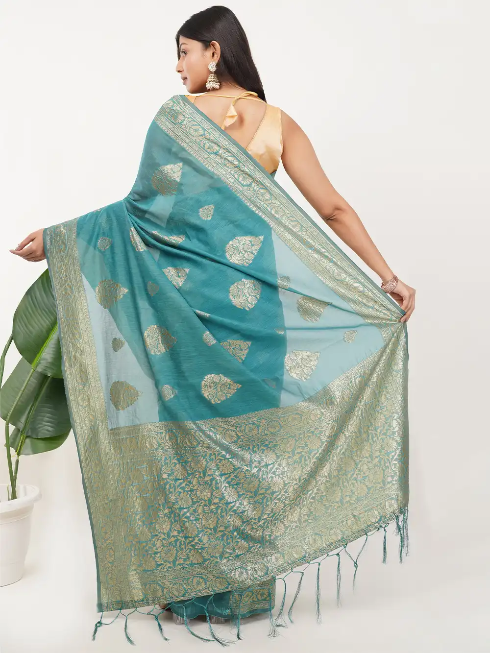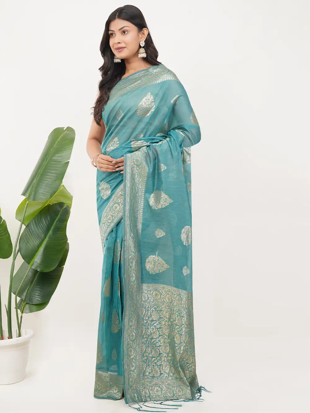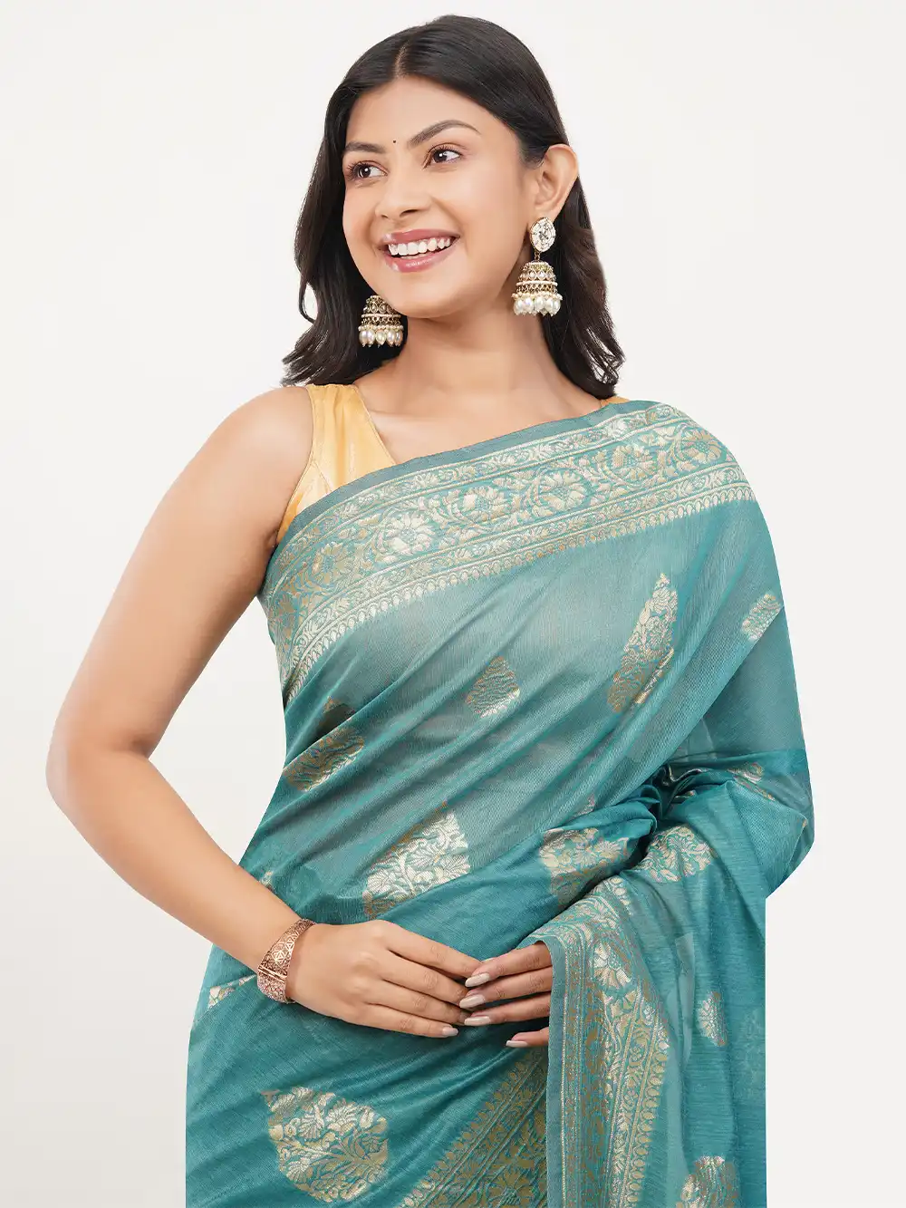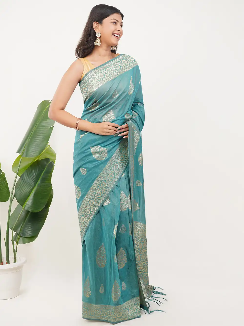 This teal ready to wear saree effortless charm with delicate gold toned woven motifs and a graceful, flowing drape. Pre stitched for ease and comfort, it’s perfect for daytime festivities, intimate celebrations and gatherings.