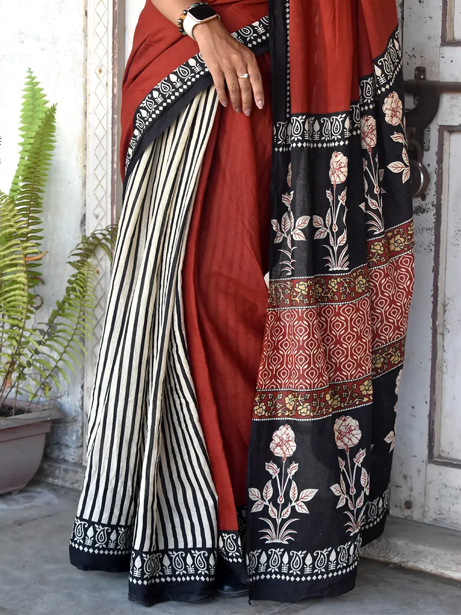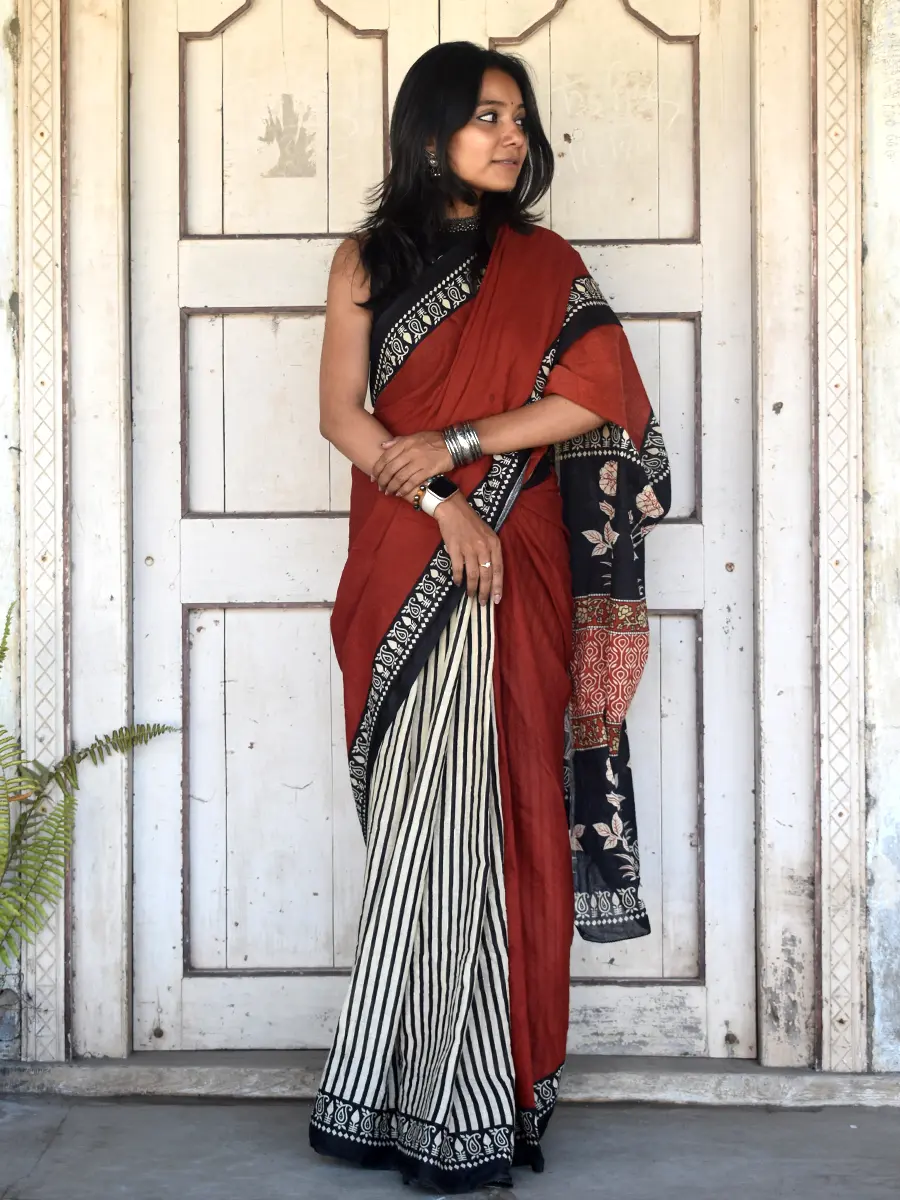 Rich and earthy, this terracotta red saree is paired with bold black printed pallu and striking striped pleats for a contemporary contrast. A perfect blend of tradition and statement style, ideal for workdays or elevated everyday wear.