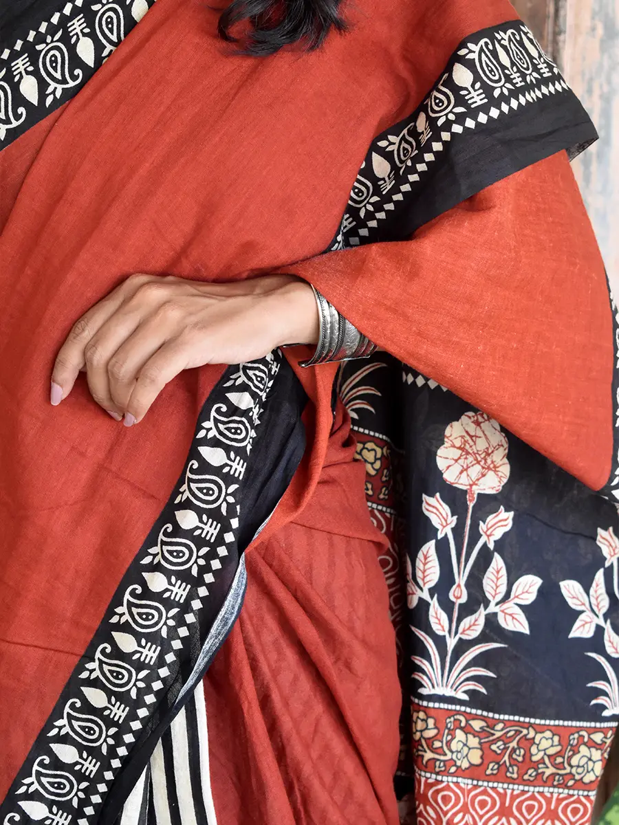 Terracotta & Ivory Printed Saree